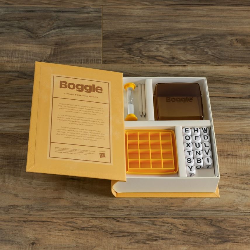 This vintage Bookshelf Edition of Boggle captures the nostalgic feel of the original game. It includes a 3-minute sand timer, score sheets, and 16 letter cubes neatly packed in a stylish bookshelf box. Rediscover the joy of this classic word game and test your vocabulary skills in style.