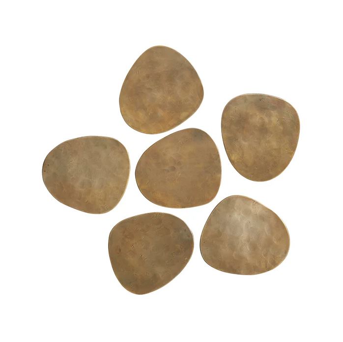 Introducing the Byron Coaster Set, a collection of six coasters with a unique organic shape. Crafted from brushed brass finish aluminium, these coasters come in assorted sizes ranging from 20, 17, to 14 cm in diameter. Enhance your home decor while protecting surfaces with this stylish and functional set.