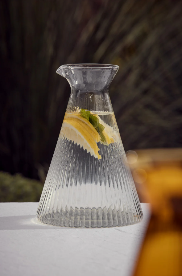 Experience the sophisticated Kairos Angular Carafe in clear glass. With intricate ribbed detailing, this stylish piece adds a touch of elegance to your dining table. Pair it with our Medium Water Glass for a complete set. (Note: Carafe only, glass sold separately)